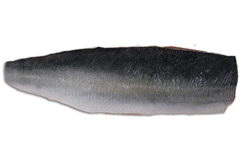 主に鮭類において、フィレ加工の処理により、トリムA~Eまでの5段階に分けられます。トリムCは、フィレにしたものから中骨、腹骨、カマ、腹部の脂肪、腹ビレ、背ビレ、さらに小骨を取った状態で一般的に「皮付き・骨なし」と呼びます。皮は残っていますので加熱調理しても身が崩れにくくなっています。