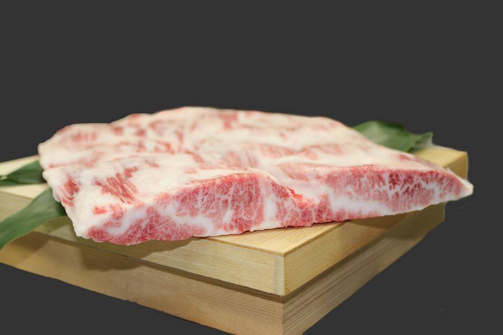 外バラの中の頭側サシのよく入った部位です。肉汁たっぷりの上質な肉質で焼肉用に適しカルビとして使われます。